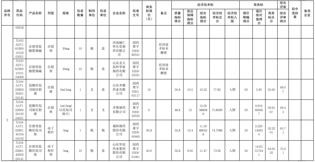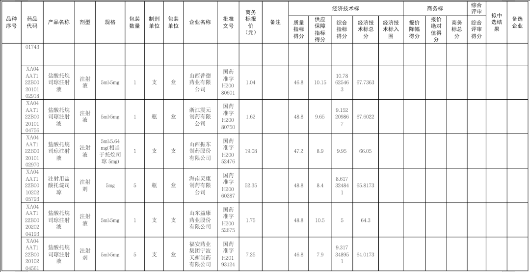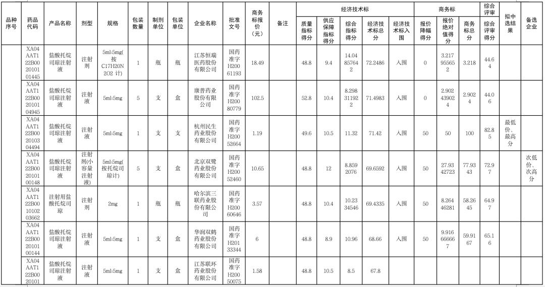 杭州民生药业的盐酸托烷司琼注射液报出了1.19元/支的超低价,大大低于同组其他竞争对手的价格,其中康普药业报最高价20.4元/支。杭州民生药业不仅在商务标报价绝对值得分拿到了50分满分,更是以综合得分82.85分的高分在众多竞品中胜出。