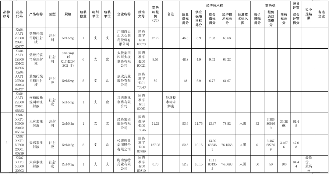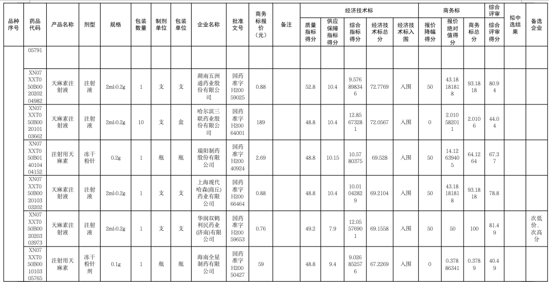 在天麻素注射液组别中,海南倍特和双鹤利民药业双双报出了0.76元的低价,但海南倍特在质量指标和供应保障指标其他评分中领先双鹤利民药业,最终以最低价和最高分中选。