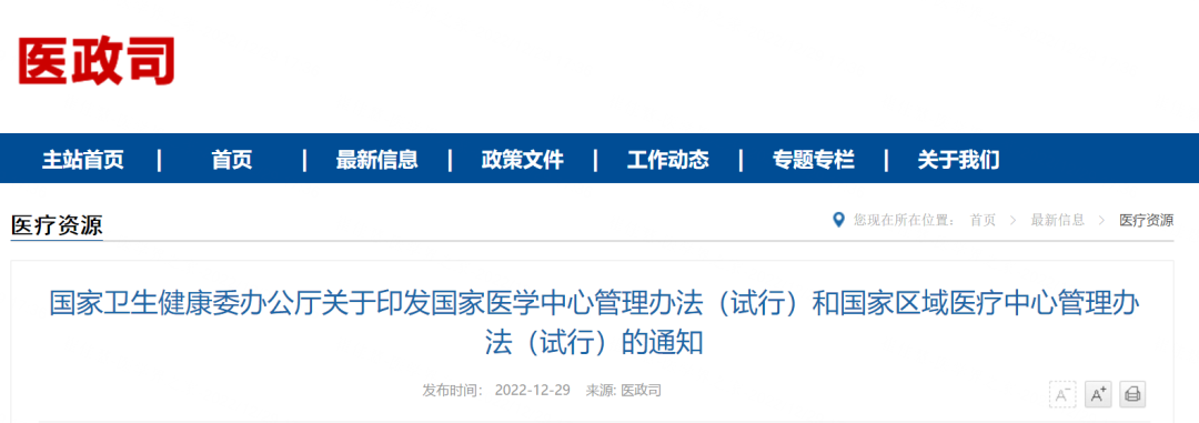 12月29日,国家卫健委官网发布《国家医学中心管理办法(试行)和国家区域医疗中心管理办法(试行)的通知》。
