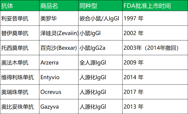 1997年第一款药品批准上市至今,抗CD20单抗已经发展到了第三代,药物活性和免疫原性都有了很大改善。第一代以人鼠嵌合单抗——利妥昔单抗为代表;第二代以人源化单抗——奥法木单抗为代表;第三代以单抗Fc段被修饰的阿妥珠单抗为代表,随着人源化程度的提高,新一代抗CD20单抗显示出越来越高的活性和越来越低的耐药性及副作用;同时新的适应症也不断被发掘。