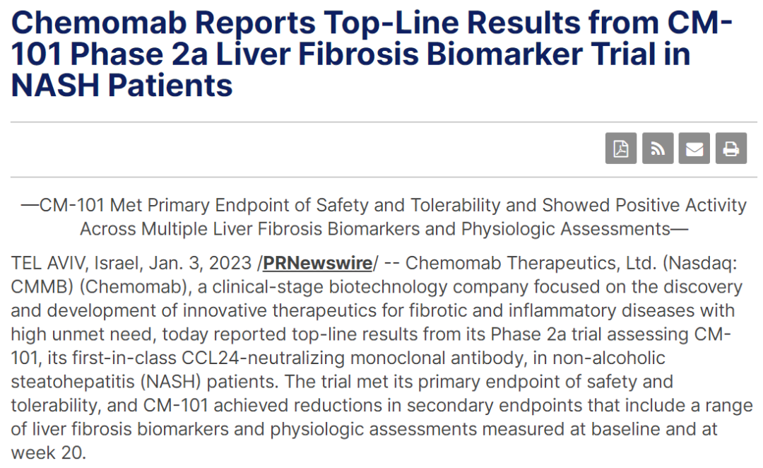 2023年1月3日,Chemomab Therapeutics公布其CCL24抗体CM-101治疗NASH的2a期临床的最新数据,研究达到安全性主要终点和疗效的次要终点。