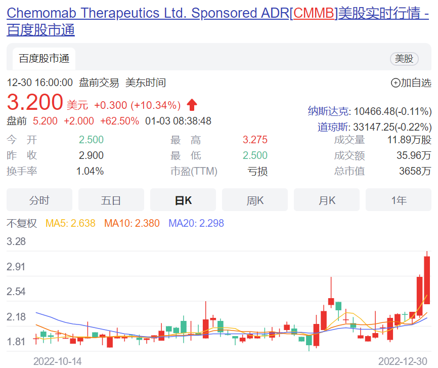 受此消息影响,Chemomab股价盘前大涨63%。
