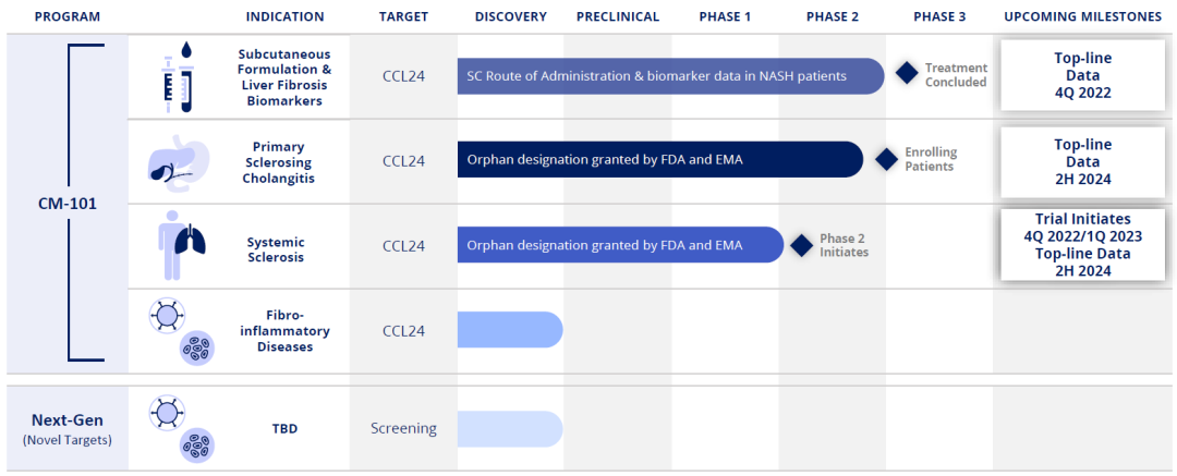 CM-101为全球首款CCL24抗体,在开发多个适应症,进展最快的为NASH。