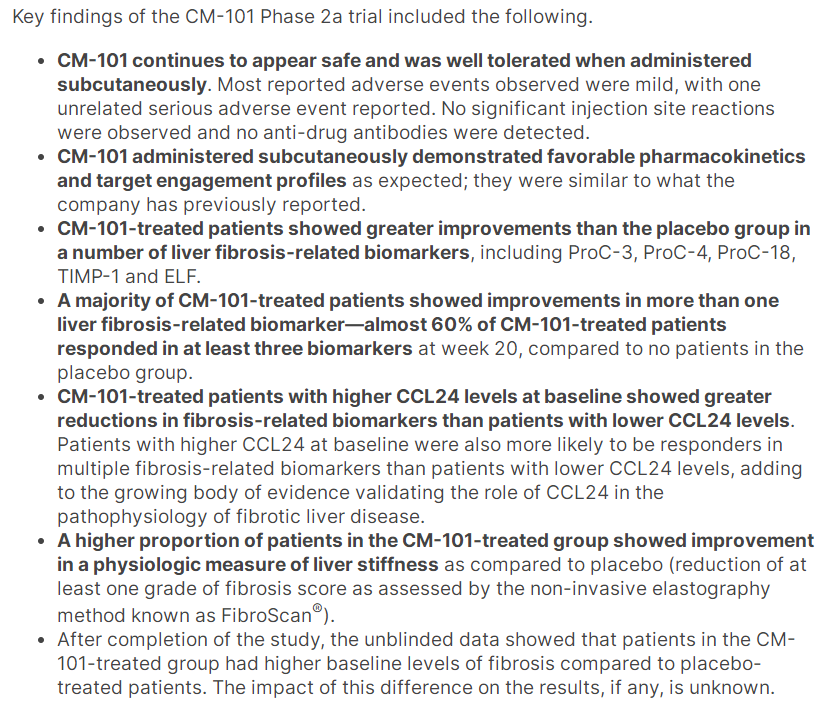 此次公开数据的2a临床中,CM-101耐受性良好,药代动力学符合预期,肝脏纤维化相关的生物标志物显著改善,治疗第20周60%的患者至少有3个生物标志物改善,而对照组这一比例为0。