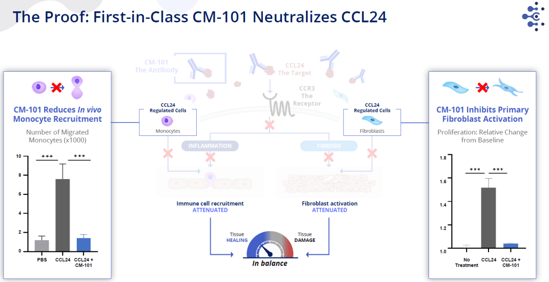 CCL24抗体CM-101可以阻断CCR3受体的相互作用,同时可以减少单核细胞的募集,抑制原代成纤维细胞的激活。