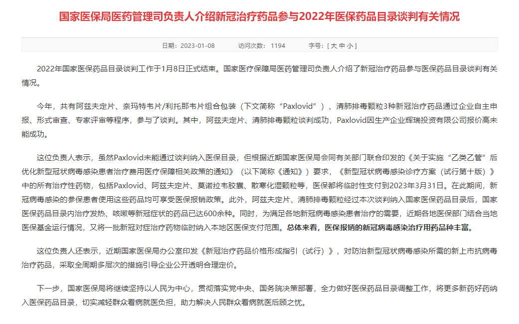 1月7日,从早上8:30到13:20离开,备受瞩目的辉瑞可能成为本次医保谈判中耗时最久的企业。正当大家在揣测p药结果如何时,1月8日,国家医保局发布大家热切关注的新冠治疗药品谈判情况。