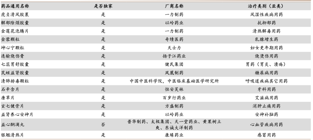 从治疗类别来看,本次谈判中成药还包括糖尿病用药、风湿性疾病用药、心脑血管疾病用药、肝病用药、胃药(胃炎、溃疡)等慢性疾病用药;还有乳腺增生药、妇女更年期用药、儿科用药等不同患者人群用药;以及清热解毒用药、止咳祛痰平喘用药、咽喉用药等针对呼吸道疾病的产品。还包括抗抑郁药、烧烫伤用药、牙科用药等其他类别用药。