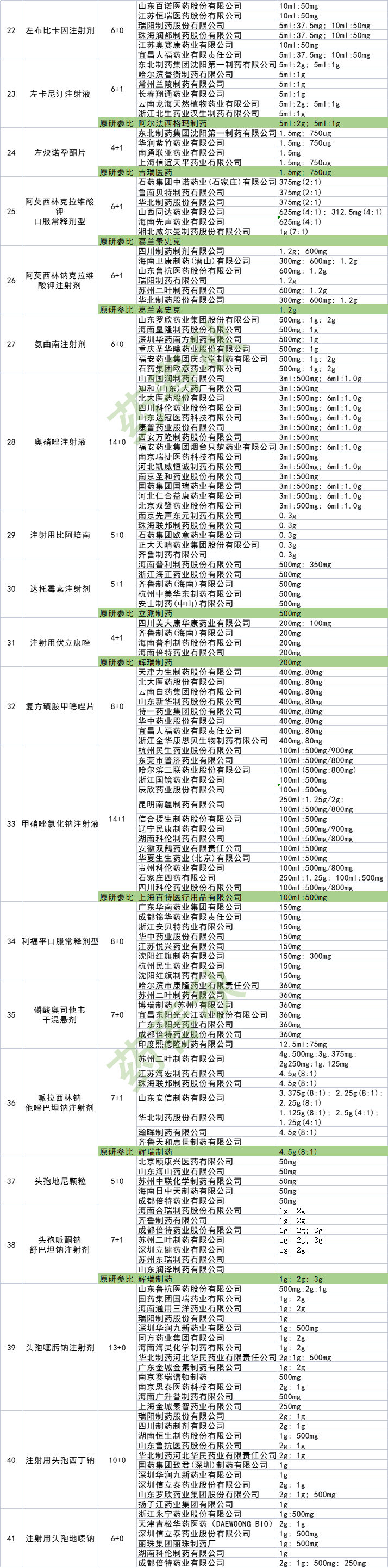 国家第八批集采目录昨日已经率先流出,此次共41个产品通用名被纳入目录,品规共181个。其中超20个为超10亿大品种,包括超80亿元的哌拉西林他唑巴坦注射剂、近70亿元的头孢哌酮舒巴坦注射剂,过评企业数暂时均为7家。