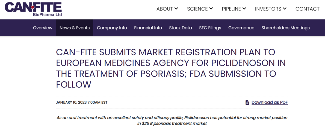 1月10日,Can-Fite公司宣布已向欧洲药品管理局(EMA)提交其核心产品piclidenoson(CF101)用于治疗中度至重度斑块状银屑病的市场注册计划。