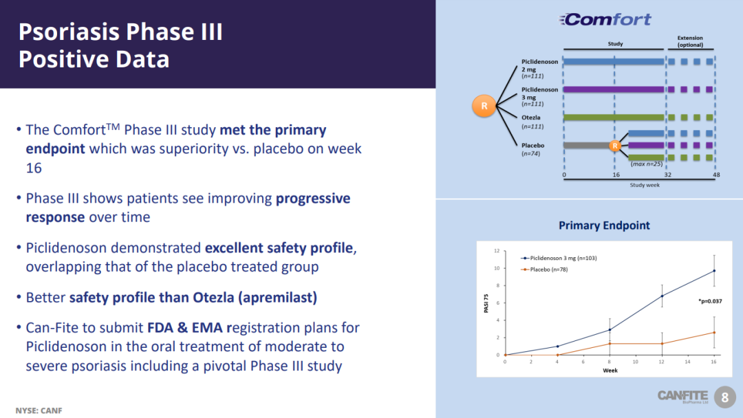Can-Fite首席执行官兼首席战略官Pnina Fishman博士说:“这一提交代表piclidenoson朝着关键III期研究和随后的上市批准迈出了重要的一步。鉴于piclidenoson独特的活性和安全性,我们相信它有可能在260亿美元的银屑病市场占有一席之地,目前该领域需要安全有效的药物。”