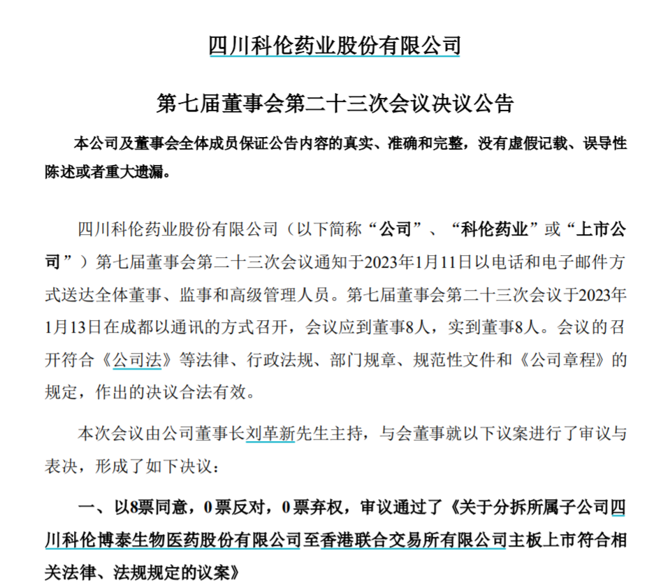 2023年1月13日晚,科伦药业发布公告,其董事会以8票同意,0票反对审议通过了《关于分拆所属子公司四川科伦博泰生物医药股份有限公司至香港联合交易所有限公司主板上市符合相关法律、法规规定的议案》。