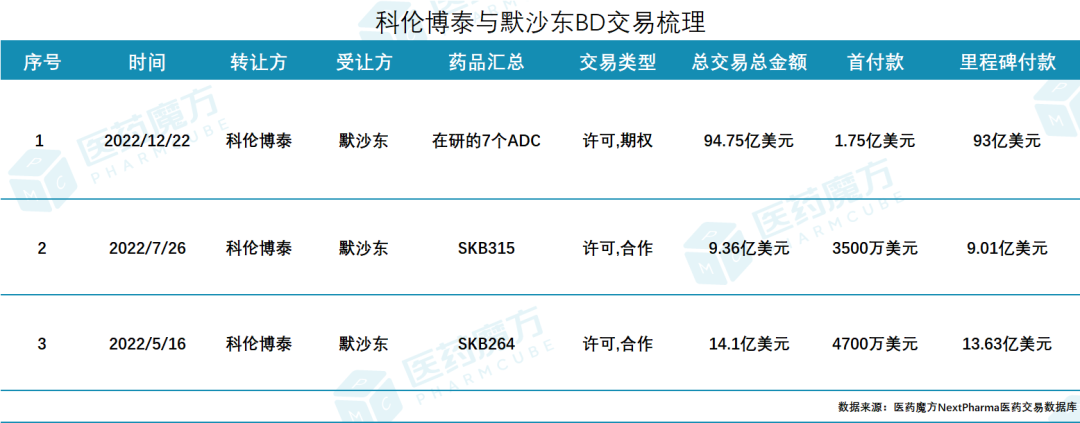 而科伦博泰与默沙东接连达成体量巨大的BD交易。医药魔方NextPharma医药交易数据库显示,2022年科伦博泰与默沙东先后达成3笔BD交易,交易合计总金额已经超过118亿美元。