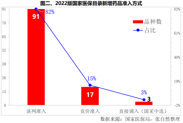 本次新增纳入医保的111个药品分别以谈判准入(91个)、竞价准入(17个)和直接调入(3个)三种方式准入,分别占82%、15%和3%。