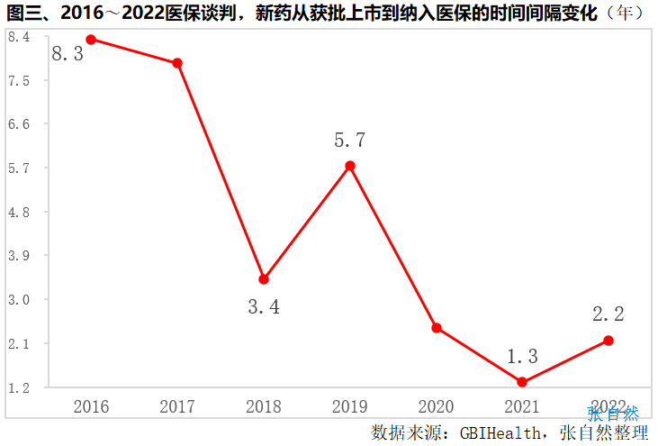 一年一度的医保谈判不断缩短新药纳入医保的时间,2016年国谈成功的3个品种,从获批上市到纳入医保平均用了长达8.3年,此后不断提速,2021年国谈这个数字仅为1.3年,缩短了7年,下降了84%。2022年略有上升,从新药上市到纳入医保的时间间隔为2.2年(详见图三)。