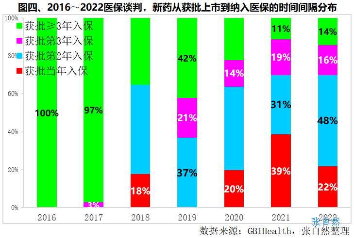 此后这一时间间隔不断缩短,2018年国谈药品在获批上市第二年纳入医保的占了47%,获批当年即纳入医保的占18%。2021年国谈药品在获批当年即进入医保的占了高达39%。2022国谈药品在获批当年即纳入医保的占了22%,获批第二年进入医保的占了近半(48%),获批第3年进入医保的占了16%。(详见图四)