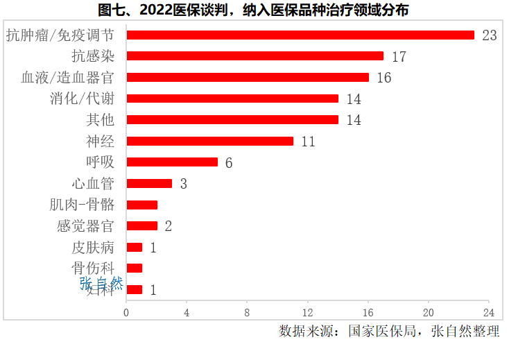新增纳入医保的111个药品中,抗肿瘤药及免疫调节剂最多,有23个,占了1/5以上。其次是全身用抗感染药以及血液和造血器官药,都超过了15个,分别为17个和16个。前述三类药品占了本次新增纳入医保总数的一半。(详见图七)
