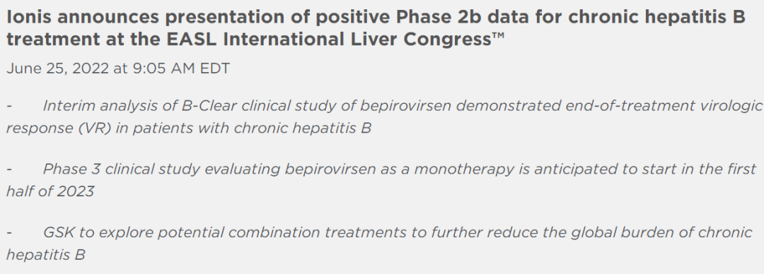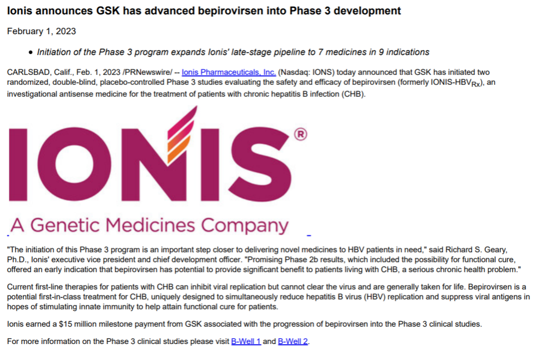 2023年2月1日,Ionis宣布合作伙伴GSK启动反义寡核苷酸(ASO)新药Bepirovirsen治疗乙肝的三期临床试验。这两项三期临床B-Well 1和B-Well 2分别计划入组534例乙肝患者。