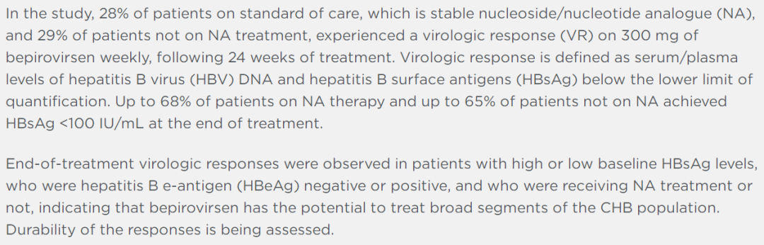 根据去年6月公布的2b期临床数据,对于接受标准核苷类似物疗法的患者(227人),在接受300毫克bepirovirsen治疗达24周的患者中,28%的患者其乙肝表面抗原和乙肝病毒DNA水平都低于可检测的最低水平(LLOQ)。对于没有接受标准疗法的患者群体(230人),接受同样条件治疗,且检测不出乙肝表面抗原和乙肝病毒DNA的患者比例为29%。也就是说,无论是否接受当前的标准治疗,Bepirovirsen都能带来类似的疗效。
