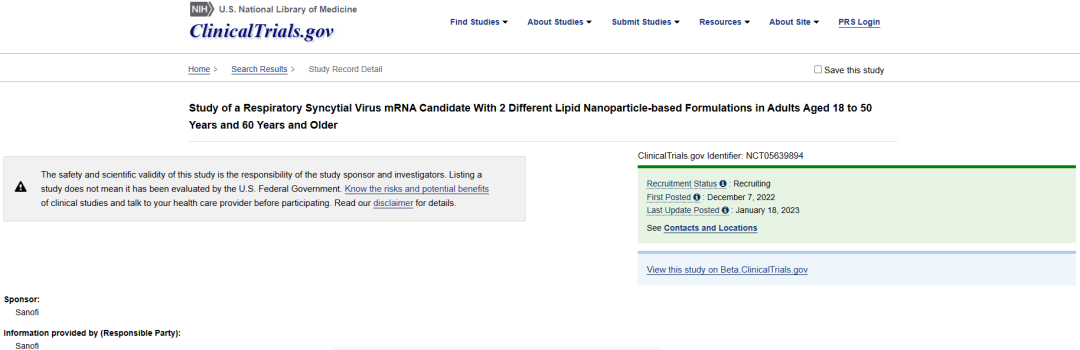 2022年12月7日,赛诺菲启动了新一代RSV mRNA疫苗的1/2期临床。该临床试验计划招募790例受试者,覆盖18-50岁及60岁以上人群,本次临床试验也将对其LNP递送系统进行探索与验证。