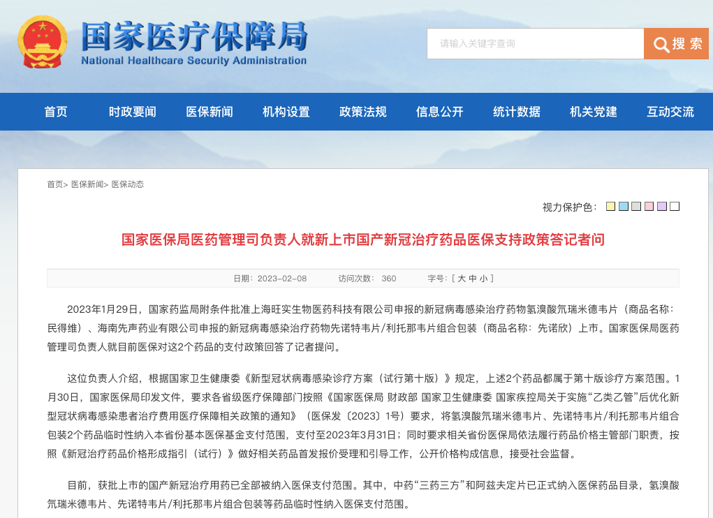 1月30日,国家医保局印发文件,要求各省级医疗保障部门按照《国家医保局 财政部 国家卫生健康委 国家疾控局关于实施“乙类乙管”后优化新型冠状病毒感染患者治疗费用医疗保障相关政策的通知》(医保发〔2023〕1号)要求,将氢溴酸氘瑞米德韦片、先诺特韦片/利托那韦片组合包装2个药品临时性纳入本省份基本医保基金支付范围,支付至2023年3月31日;