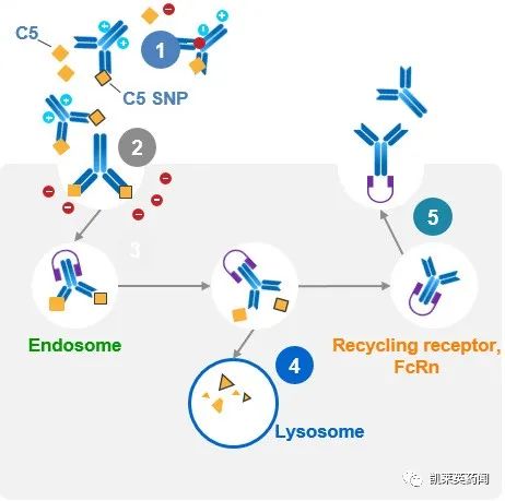Crovalimab(珂罗利单抗)是一种通过连续单克隆抗体回收技术(Smart-Ig)工程化改造的新一代C5抑制剂,可以阻断补体C5裂解为C5a和C5b,有望抑制补体活化。该药物结合了等电点、新生儿Fc受体(FcRn)和pH依赖性亲和性技术,使其不仅能够与C5高效结合,使内皮细胞对与C5结合crovalimab的吸收增强,同时还可以使新生儿Fc受体介导的crovalimab高效再循环。2022年8月,珂罗利单抗注射液的上市申请已获得受理,并被纳入优先审批品种,拟用于治疗PNH。除PNH,目前crovalimab还被开发用于非典型溶血性尿毒症(aHUS)、镰状细胞病和其他补体介导的疾病。