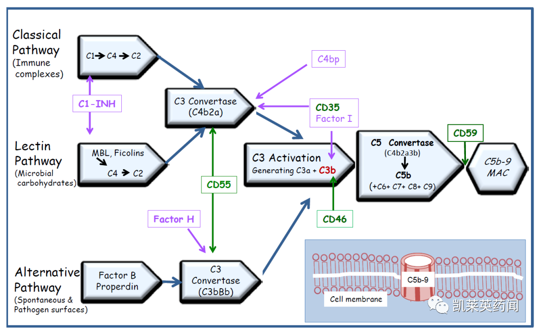 补体系统是先天免疫系统的一部分,补体由经典通路、替代通路和凝集素通路三种途径之一激活,产生一系列蛋白水解裂解,以增强免疫反应或形成膜攻击复合体(MAC)。C1处于经典通路的上游,C3属于三条通路的汇集点,而C5则位于通路末端。在正常情况下,血管内溶血由CD59阻断,CD59能阻止补体反应的最后一步,即阻止在靶细胞上形成孔的MAC。倘若患者红细胞缺乏,将CD59连接至其表面的GPI锚而导致血管内溶血;靶向末端补体C5能阻止MAC复合物的形成,阻断血管内溶血。