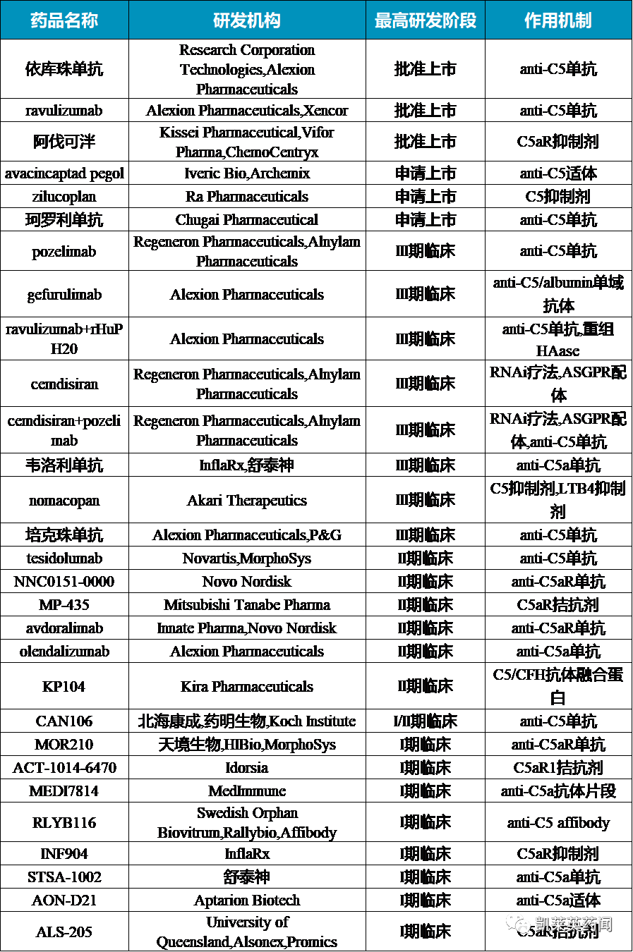 据不完全统计,目前针对C5补体开发的药物近50余种,将目前处于临床及以上阶段的药物整理如下: