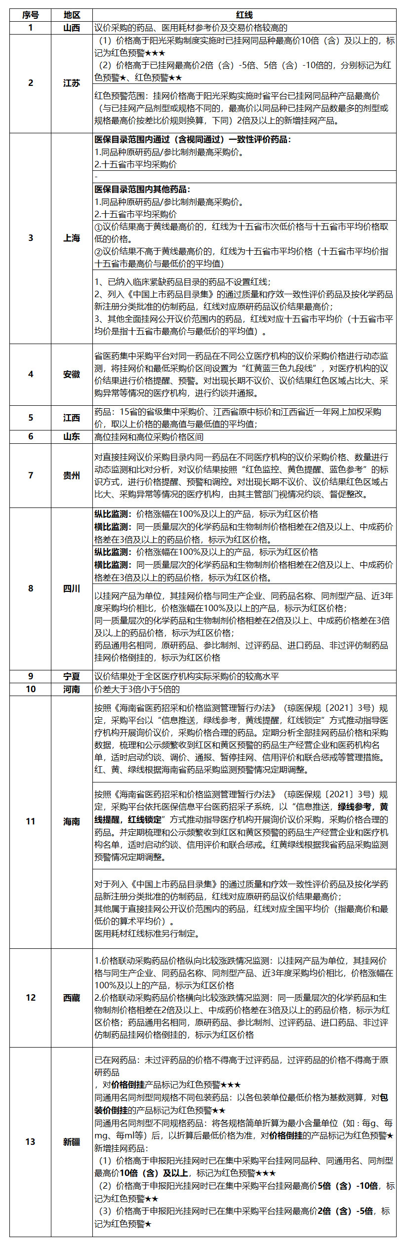目前多省已经出台药品挂网价格红线要求。以江苏为例,根据相关政策,挂网价格高于阳光采购实施时省平台已挂网同品种产品最高价(与已挂网产品剂型或规格不同的,最高价以同品种已挂网产品数最多的剂型或规格最高价按差比价规则换算)2倍及以上的新增挂网产品将被列为红色预警范围;而挂网价格高于阳光采购实施时省平台已挂网同品种产品最高价但不足2倍的新增挂网产品为黄色预警范围,该省将对此实行价格预警动态管理。