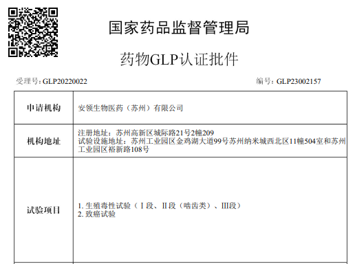 近日,滬港中科全资子公司——安领生物医药(苏州)有限公司(以下简称“安领(苏州)”)收到国家药品监督管理局签发的GLP证书(注册号为:GLP23002157),顺利通过生殖毒性试验(Ⅰ段、Ⅱ段(啮齿类)、Ⅲ段)以及致癌试验试验项目。这标志着安领(苏州)运行的药物评价中心,经过国家药品监督管理局严格的现场检查,在组织管理和人员、仪器设备和实验材料、标准操作程序以及试验运行等方面均符合GLP要求,顺利通过了国家GLP认证。