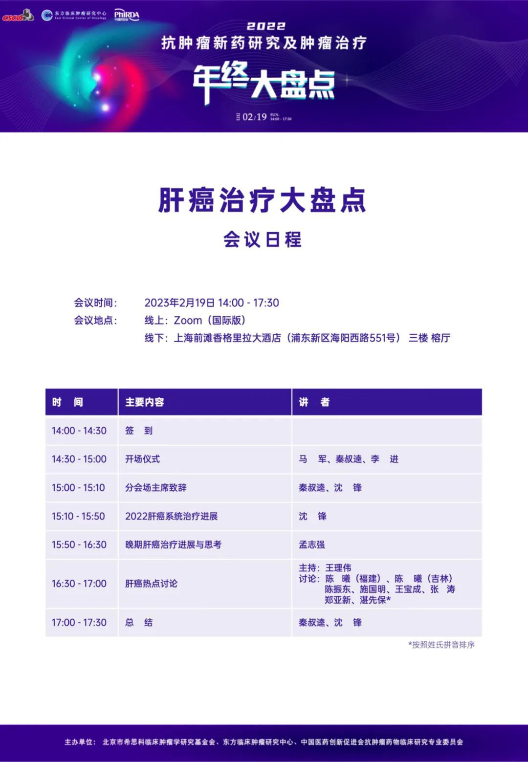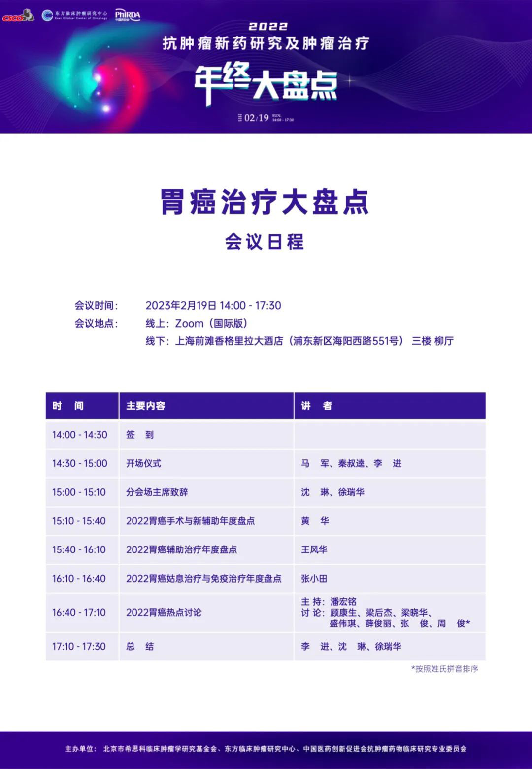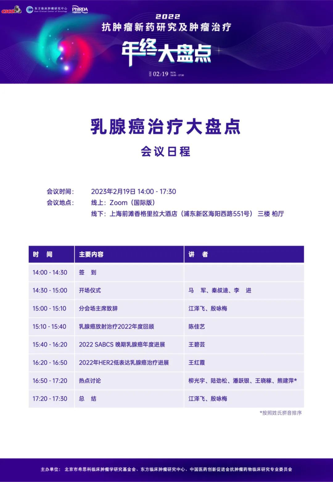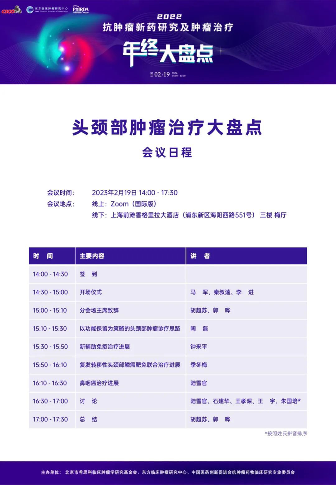 大家好!由北京市希思科临床肿瘤学研究基金会、杭州东方临床肿瘤研究中心(ECCO)与中国医药创新促进会抗肿瘤药物临床研究专业委员会共同主办的“2022 抗肿瘤新药研究及肿瘤治疗年终大盘点”将于2023年2月19日线上线下同步召开。