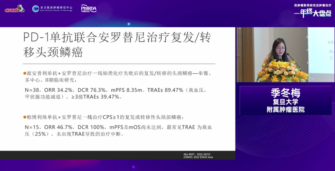 紧接着,复旦大学附属肿瘤医院季冬梅教授分享了关于“复发转移性头颈部鳞癌靶免联合治疗进展”的主题演讲,分析了免疫治疗联合抗血管新生药物、表皮生长因子受体(EGFR)抑制剂等。