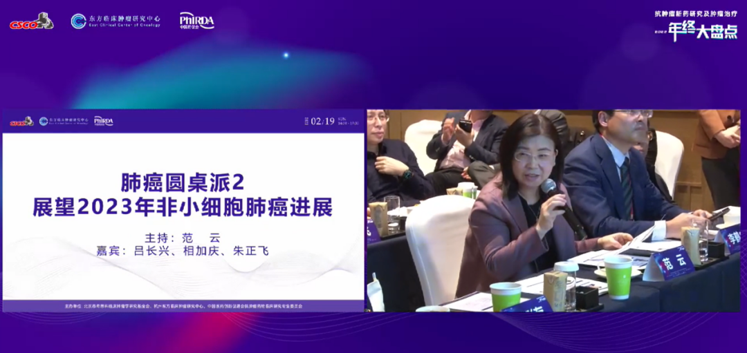 第二轮由中国科学院大学附属肿瘤医院范云教授主持,主题为“展望2023年非小细胞肺癌进展”,参与讨论的嘉宾有上海交通大学附属胸科医院吕长兴教授、复旦大学附属肿瘤医院相加庆教授、复旦大学附属肿瘤医院朱正飞教授,围绕如何更精准、安全、有效治疗局晚期NSCLC进行了深入交流。