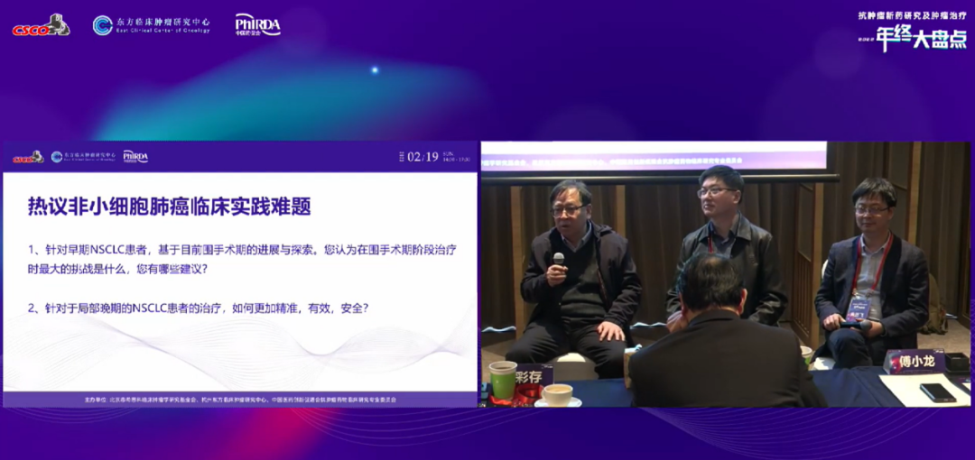 第三轮由上海交通大学附属胸科医院傅小龙教授、上海交通大学医学院附属瑞金医院李鹤成教授主持,主题为“热议非小细胞肺癌临床实践难题”,参与本环节的嘉宾有浙江大学医学院邵逸夫医院陈恩国教授、苏州大学附属第二医院施敏骅教授、复旦大学附属肿瘤医院王佳蕾教授,就晚期NSCLC治疗的未来十年基石进行了一番讨论。