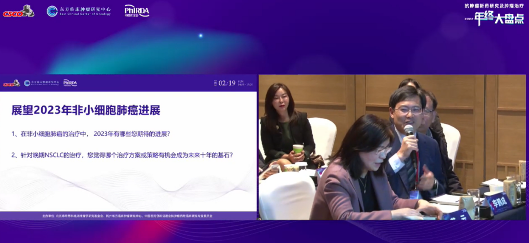 接下来是三轮圆桌讨论会,第一轮由同济大学附属上海市肺科医院周彩存教授、上海市胸科医院韩宝惠教授主持,主题为“盘点2022年非小细胞肺癌成果”参与本环节的专家有上海交通大学附属胸科医院储天晴教授、复旦大学附属中山医院胡洁教授、温州医科大学附属第一医院李文峰教授,嘉宾们就晚期非小细胞肺癌(NSCLC)在免疫联合化疗的基础上如何延长患者生存进行了讨论。