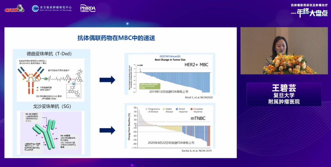 首先,复旦大学附属肿瘤医院王碧芸教授为我们带来了“2022 SABCS晚期乳腺癌年度进展”的精彩授课,提到2022是抗体偶联药物的重磅年。