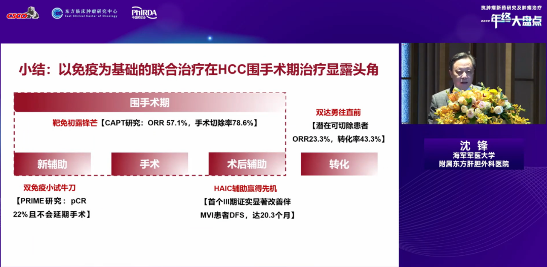 首先,由海军军医大学附属东方肝胆外科医院沈锋教授为我们带来了“2022肝癌系统治疗进展”的主题演讲,围绕着围手术期治疗、局部联合系统治疗、晚期系统治疗为我们进行了详尽的分析。接着,复旦大学附属肿瘤医院孟志强教授为我们介绍了“晚期肝癌治疗进展与思考”,提及了HIMALAYA、LEAP-002、LAUNCH等研究。
