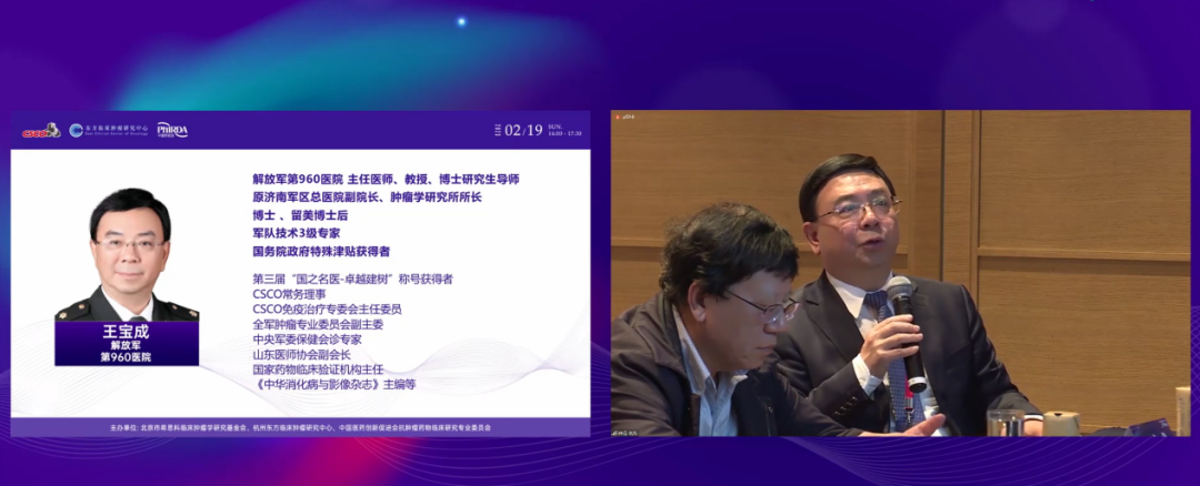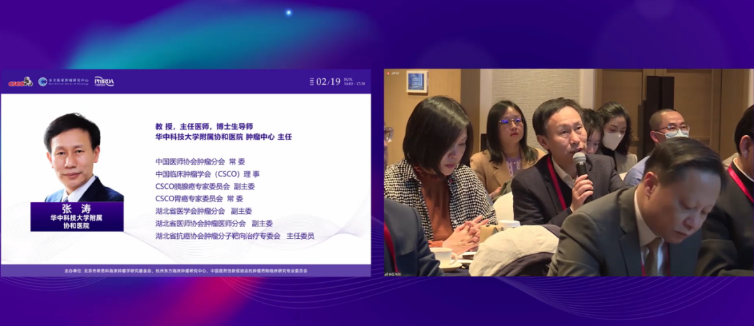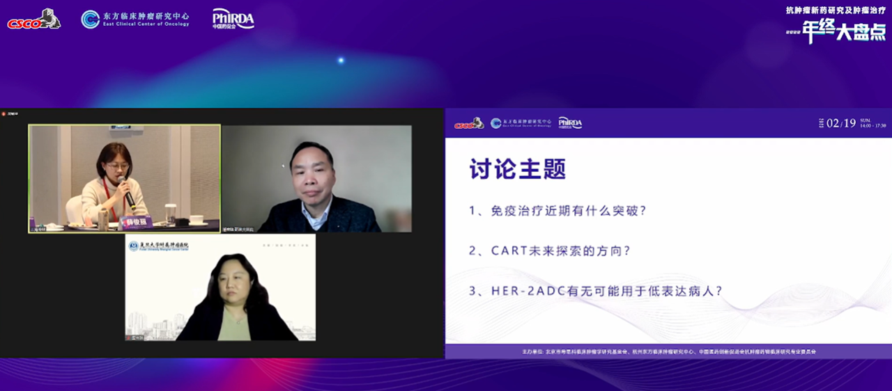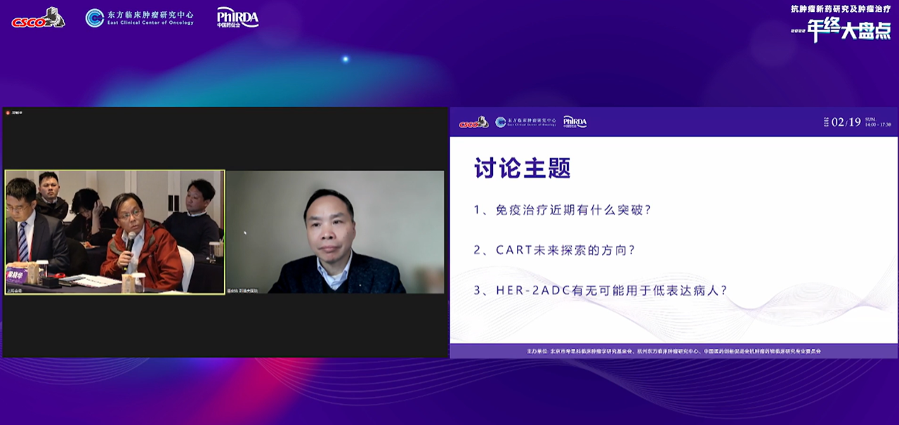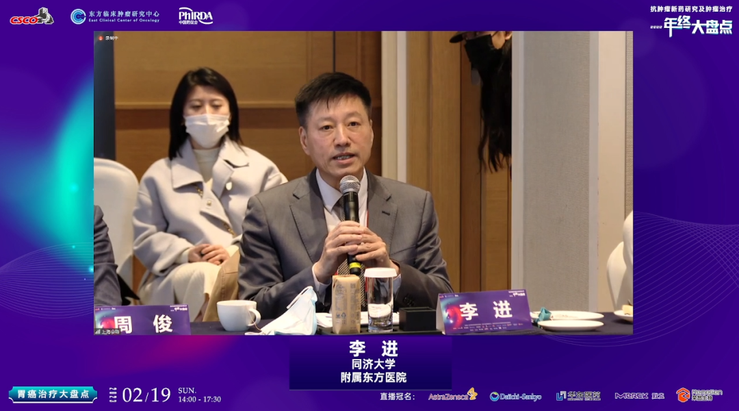 最后的“2022胃癌热点讨论”阶段由浙江大学医学院附属邵逸夫医院潘宏铭教授主持,参与讨论的嘉宾包括有安徽医科大学第一附属医院顾康生教授、复旦大学附属华山医院梁晓华教授、复旦大学附属肿瘤医院盛伟琪教授、同济大学附属东方医院薛俊丽教授、上海交大医学院附属瑞金医院张俊教授、上海阿特蒙医院周俊教授,围绕免疫治疗的最新突破、CAR-T未来探索方向、HER-2 抗体偶联药物(ADC)可否用于低表达病人这三个问题展开讨论。