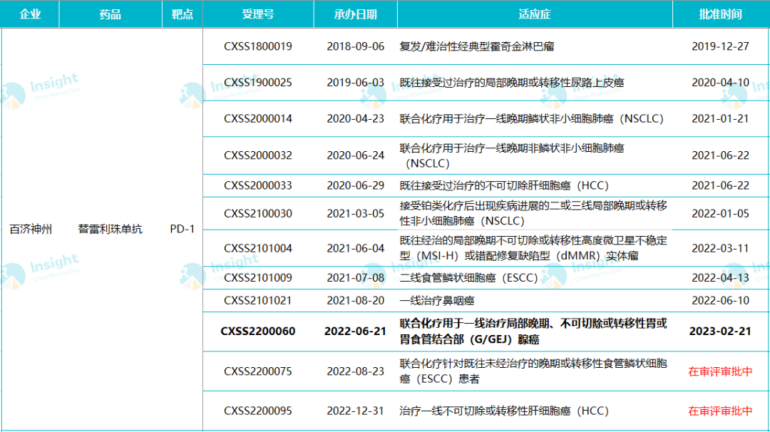 2 月 24 日,NMPA 最新批件显示,百济神州 PD-1 抑制剂替雷利珠单抗的新适应症获批上市,联合化疗用于一线治疗局部晚期、不可切除或转移性胃或胃食管结合部(G/GEJ)腺癌。值得一提的是,这是替雷利珠单抗第 10 个获批上市的适应症。