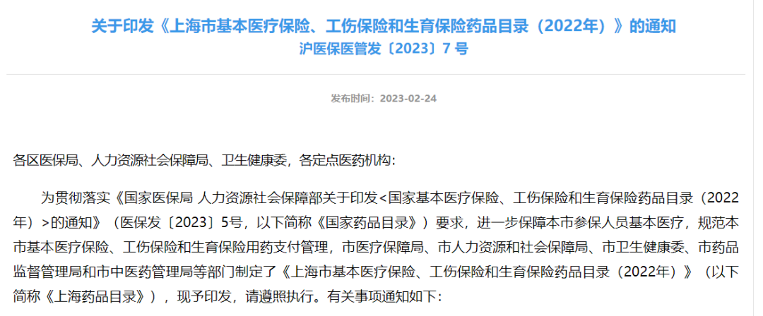 近日,上海市医保局发布通知(沪医保医管发〔2023〕7 号),对2022版国家药品目录的落地执行做出了安排。
