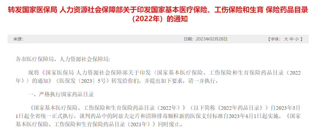 上海:上海药事所发布《关于开展2022年国家医保目录新增药品挂网工作的通知》,新增医保谈判(含竞价药品)、新增医保目录药品于2023年2月7日由“上海市医药采购服务与监管信息系统”向医院推送药品信息,2023年2月10日生效。