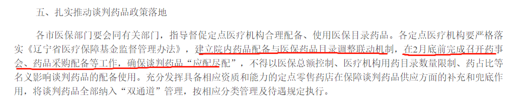 《通知》要求完善“双通道”管理机制。在继续保留原“双通道”药品清单的基础上,将新增谈判、竞价药品纳入“双通道”药品范围。“双通道”药品名单(共383个)可点击文末阅读原文获取。《通知》还要求依托全国统一信息平台,在2023年12月31日前实现市内“双通道”处方流转电子化。2月28日,辽宁发布通知,要求建立院内药品配备与医保药品目录调整联动机制,在2月底前完成召开药事会、药品采购配备等工作。