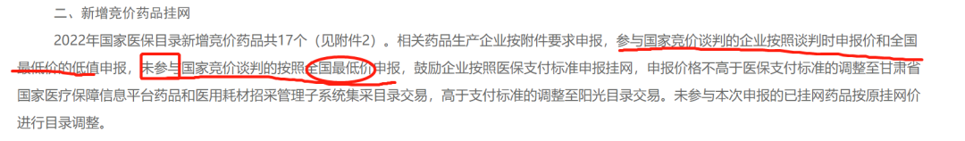 甘肃的国谈药物挂网方案里明确:未参与竞价的按全国最低价申报。
