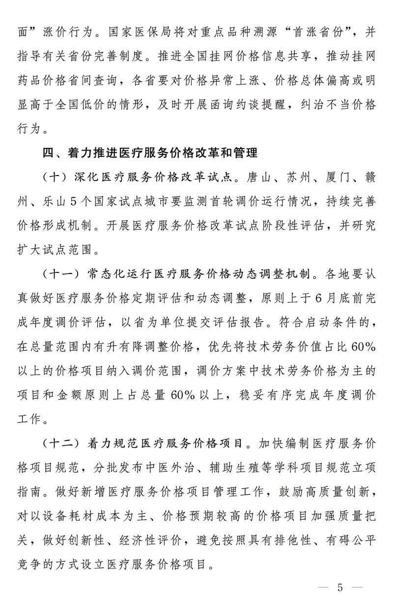 各地要认真做好医疗服务价格定期评估和动态调整,原则上于6月底前完成年度调价评估,以省为单位提交评估报告。符合启动条件的,在总量范围内有升有降调整价格,优先将技术劳务价值占比60%以上的价格项目纳入调价范围,调价方案中技术劳务价格为主的项目和金额原则上占总量60%以上,稳妥有序完成年度调价工作。