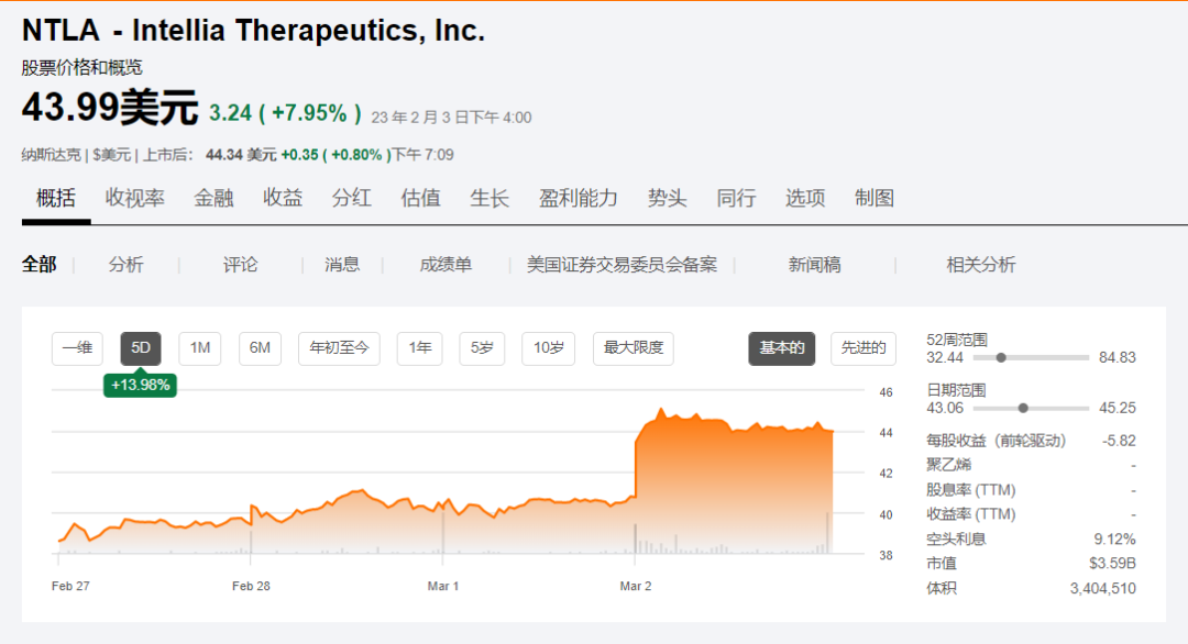 受此影响,Intellia 周四股价上涨 8%。Intellia 是由 CRISPR 基因编辑技术奠基人、诺奖得主Jennifer Doudna创立的基因编辑治疗公司,目前市值约35.9亿美元。