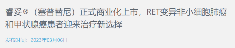 2022年9月30日,国家药品监督管理局附条件批准睿妥®在中国用于RET融合阳性的非小细胞肺癌、RET融合阳性的甲状腺癌、RET突变型甲状腺髓样癌的治疗。该药物由礼来制药研发,信达生物负责中国商业化。