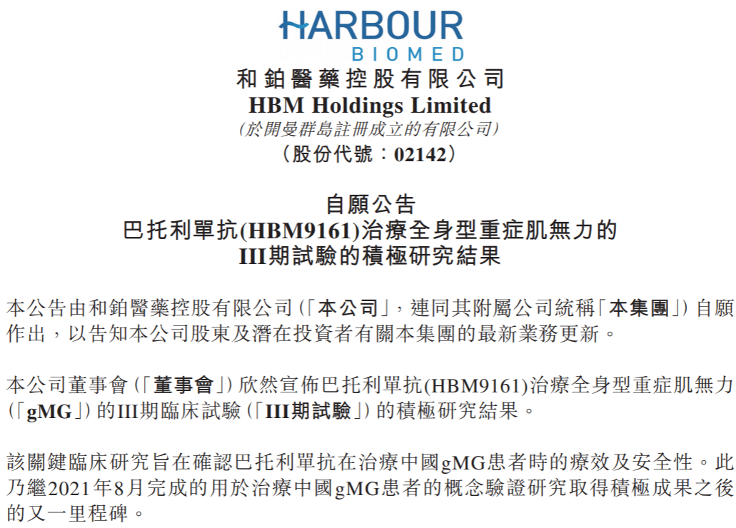 2023年3月6日,和铂医药宣布FcRn抗体巴托利单抗治疗全身型重症肌无力(gMG)的三期临床试验达到主要终点和关键次要终点。