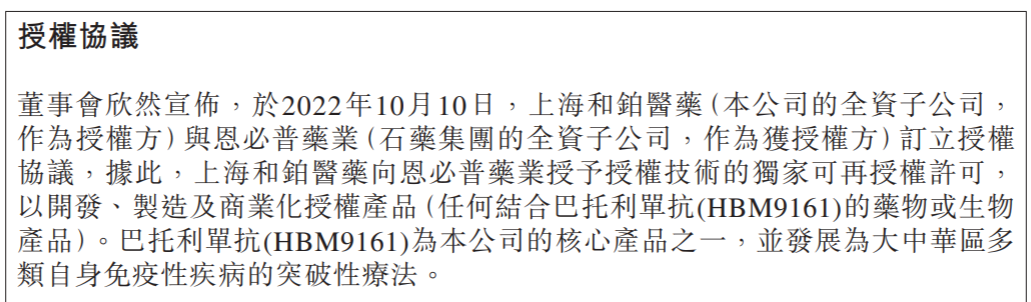 2022年10月,和铂医药将巴托利单抗的大中华区权益授权给石药集团,后者支付1.5亿元预付款,8.61亿元里程碑金额,以及一定比例的销售分成,协议总金额超过10亿元。