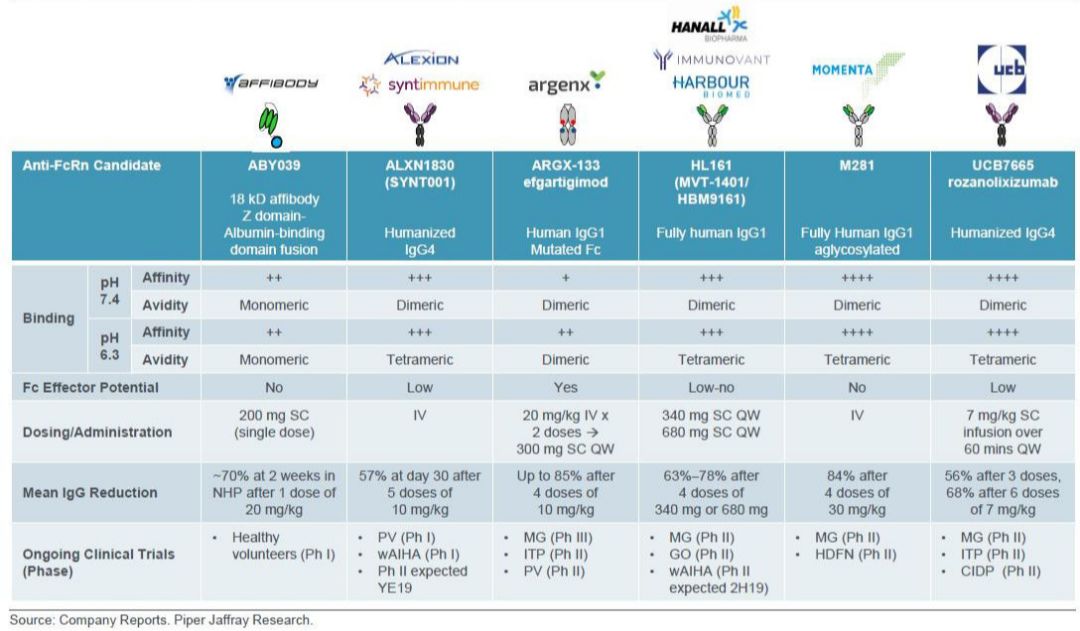 以往靶向B细胞往往着眼于B细胞marker如CD20、CD19,或增殖信号BLys、BTK等。FcRn则扮演着IgG循环并达到长效的角色,阻断FcRn则可以直接一直浆B细胞的效应蛋白-IgG抗体。许多自身免疫病的致病机制正是其自身抗体,因此FcRn有望成为自身免疫病领域又一个超级重磅炸弹。