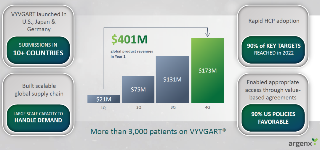 Argenx的Efgartigimod上市首年实现4亿美元销售额,随着适应症扩展将进一步提高。