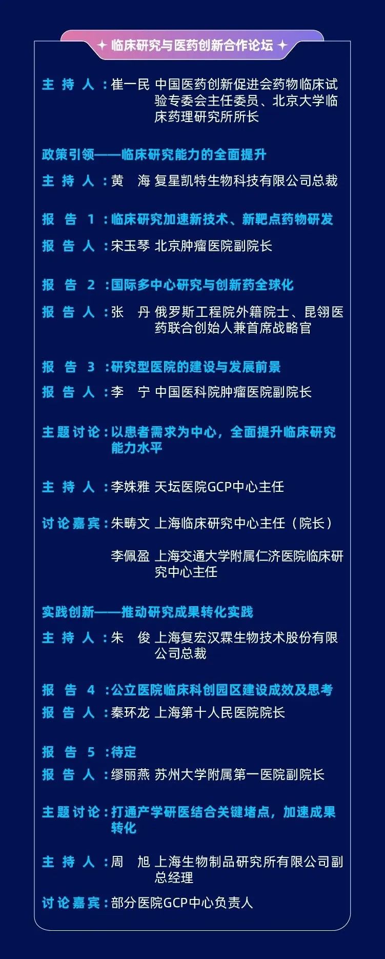 创投大会下设7场主题路演专场和12场主题论坛(查看日程),其中“临床研究与医药创新合作论坛”将邀请众多国内外顶尖研究机构专家学者,以政策指导和创新实践两个层面为抓手,从国际化、产业化、专业化视野解读政策与分享经验,聚力推动临床研究与成果转化。